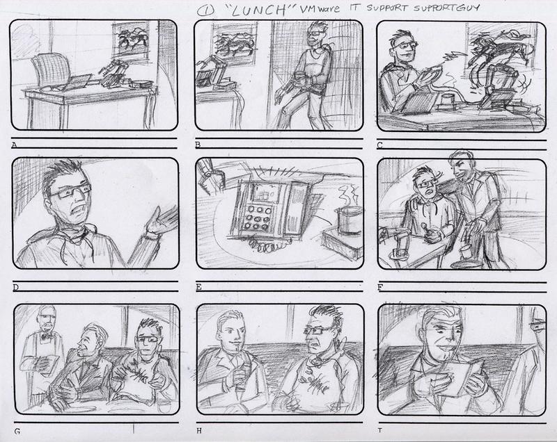 The following storyboards to the right are to be used to live ad shots. I have only shown a portion of the work as they are in production on these at the moment. I did storyboards for three ads and these were for VMWare.